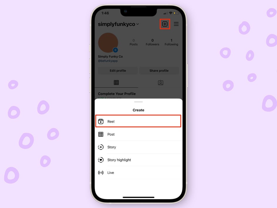 At the top of your app, select the addition button. When the menu pops up, select Reel.