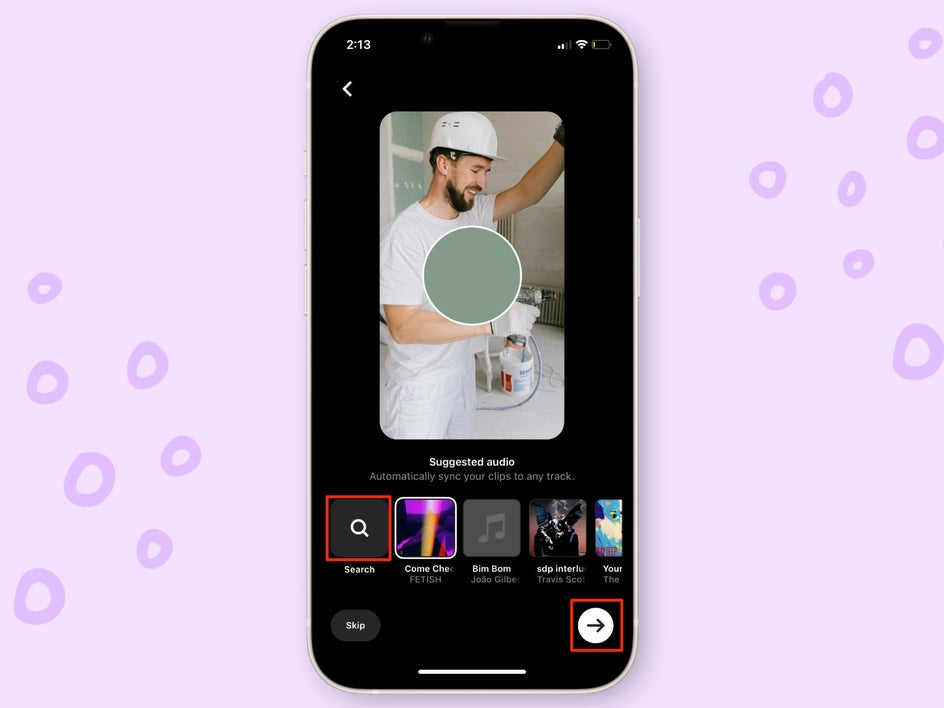 Press the Search button to select audio. You can check out this article from Later for the latest trending audio.