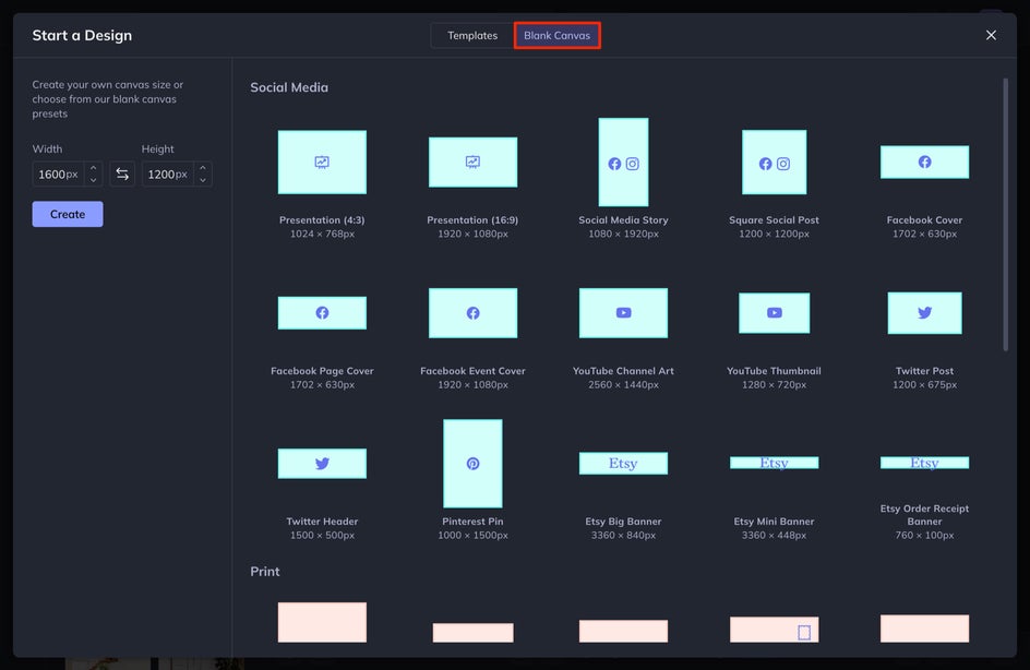 From BeFunky’s Graphic Designer, select the Blank Canvas tab at the top of the screen and then select Social Media Story from the Social Media group.