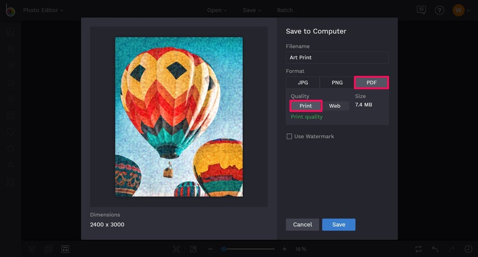 We recommend saving your image as a PDF file for the highest print quality. To do this, click Computer, followed by PDF and Print. Then, click Save.