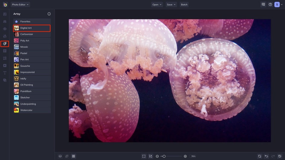 Open up the Cartoon effects category of the Photo Editor and upload any high-quality photo you want to edit. (You can also get here manually through the Artsy tab.)
