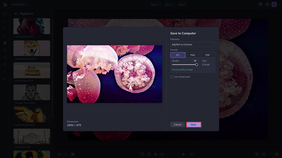 Along with the DLX and GFX effects, the Photo Editor also features six classic Cartoonizer effects that mimic the look of traditional comic books and animation. Play around with these styles to find the best fit for your project! This example uses Cartoonizer 6 for a traditional comic style.