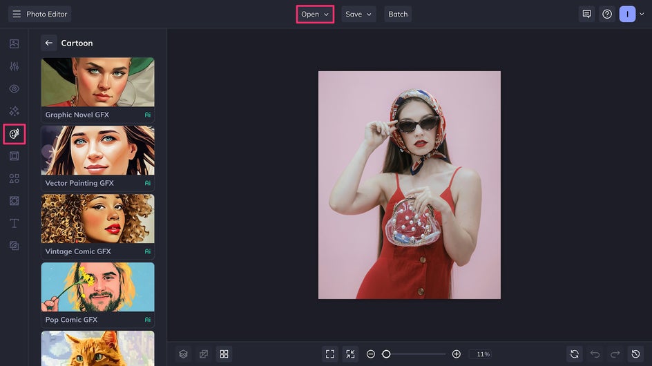 You can find some of the best AI cartoon filters in the Artsy Effects tab of the BeFunky Photo Editor. Most are in the Cartoon section, but you’ll also find some in the Cartoonizer and Digital Art sections. Here’s a rundown of each effect and our recommendations on how to use them!