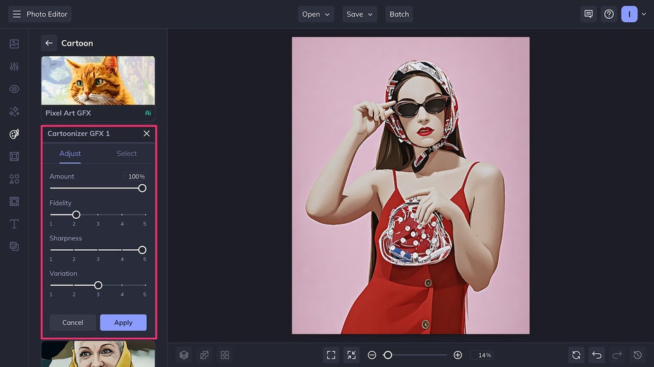 Here, we’re using Cartoonizer GFX 1 for a bold, lineless piece of digital art that looks like it could have been rendered for 3D animation. In just one click, we’ve turned our photo into a cartoon! If you’re happy with the result, you can stop here and skip to Step 4, or continue to Step 3 to keep customizing the effect.