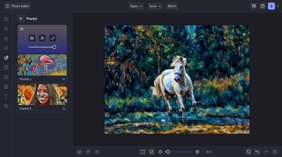 Ready to convert a photo into a pastel drawing online? Head directly to the Pastel category within our Photo Editor and open to the photo you wish to convert into a pastel drawing. Then, just follow the steps below!