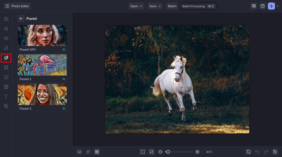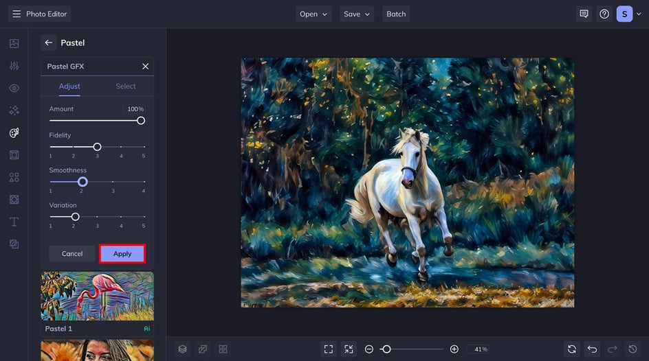 Click on each Pastel effect to sample how it looks on your image. You can adjust the strength of the effect using the corresponding slider. For our tutorial, we chose Pastel GFX. This effect utilizes generative AI to create stunning, hyper-realistic pastel drawings from any image.