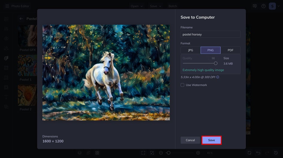 When you’ve finished turning your photo into pastel art, select Save at the top of the screen and then choose the best destination for your new digital pastel drawing.