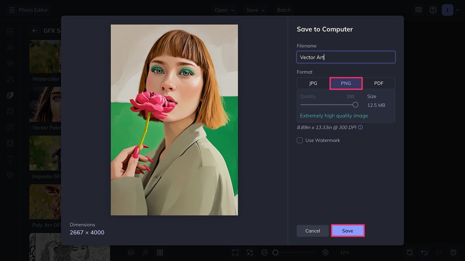 Luckily, if you don’t have the time or experience to create vector art yourself, the Photo Editor’s Vector Painting GFX tool can do it for you. You can use it to create high-resolution graphic art, create backgrounds for invites or headers for websites, or even transform a portrait to resemble a cartoon.