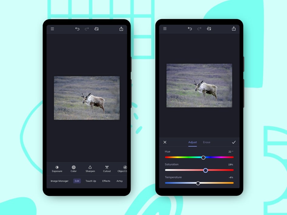 BeFunky’s Color tool makes it easy to adjust the colors in your composition. Use the slider to adjust hue, temperature, and saturation, allowing you to draw out the colors in your image.