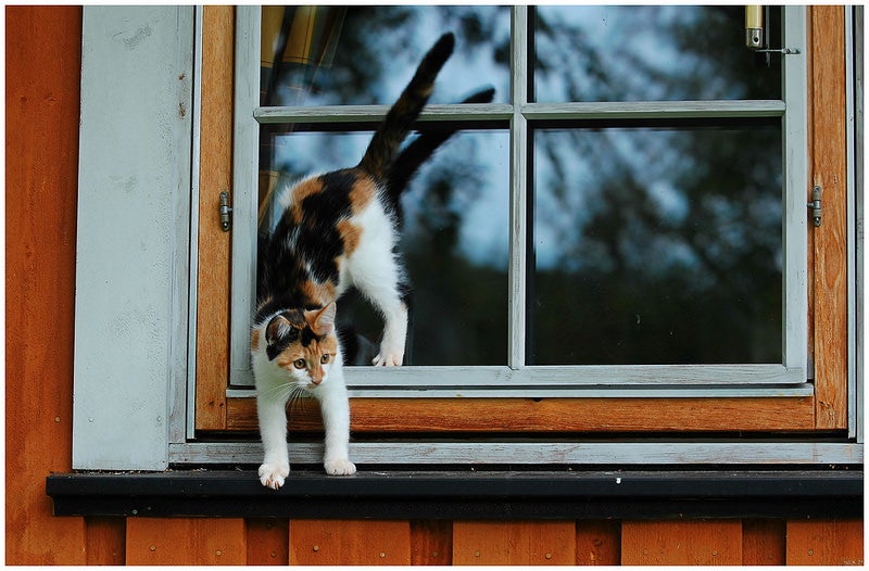It's very exciting to find a fun cat photo on Caturdays! My favorite detail on this photograph are the colors, the kitty's fur goes amazingly with the window frame and the wooden wall; the reflection on the glass adds the perfect contrast to this shot.