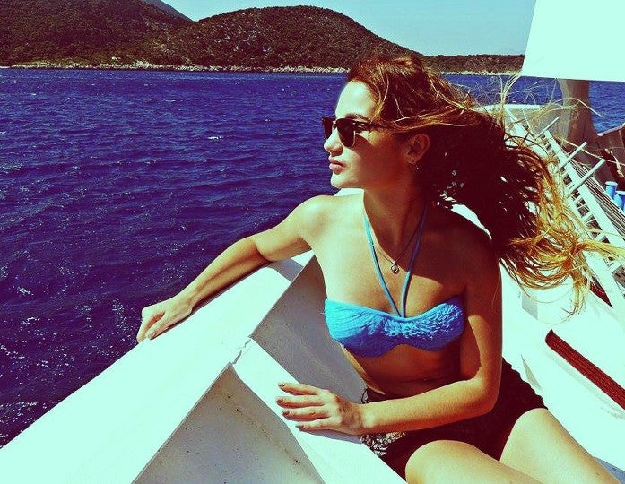 This summer photo comes together with vintage tones of blue: the sky, the ocean and her bathing suit.