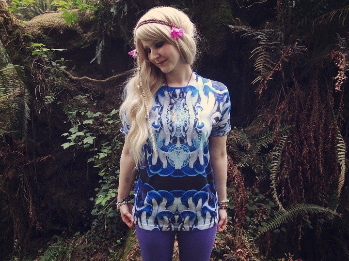 Blue and green ray lights reflect on her hair as she waits… and waits…