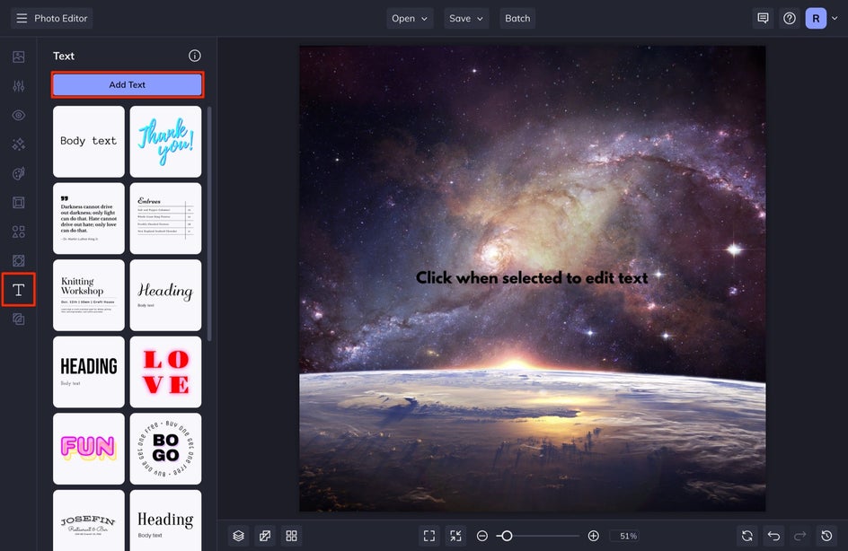 Once you’ve got your photo background sized and shaped just right, it’s time to add your quote. Click on the Text tab in the left-hand menu and select Add Text. A text box will appear on your photo.