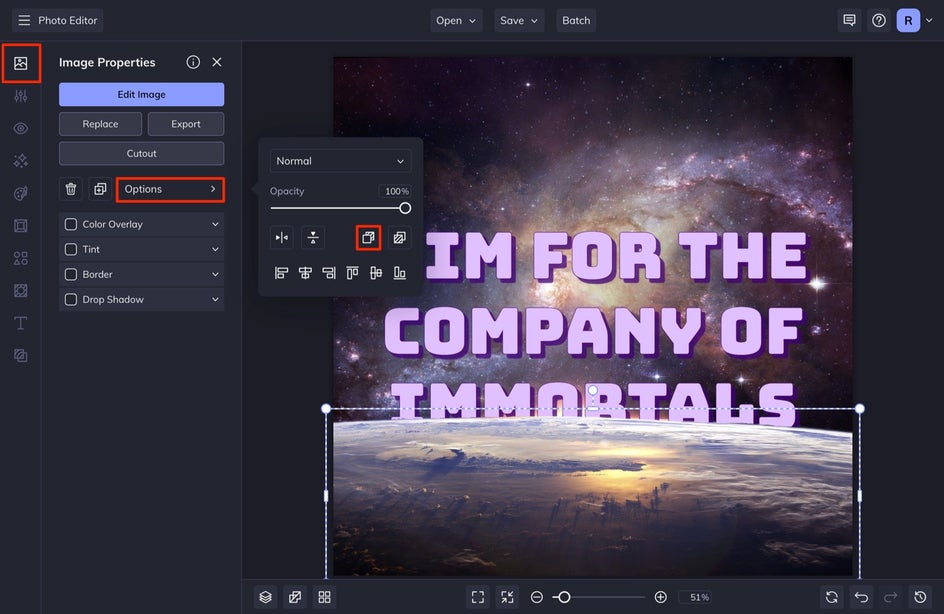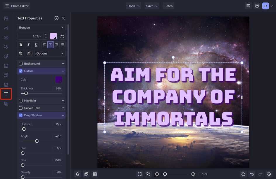 Double-click into the text box and paste your quote inside. Any time you single-click on a text box, you’ll find that a Text Properties menu appears, allowing you to change the Font, Size, and Color. In the Options setting, you can also change the Letter Spacing and Line Spacing. We changed the Size and gave our text a Drop Shadow and Outline to make it stand out.