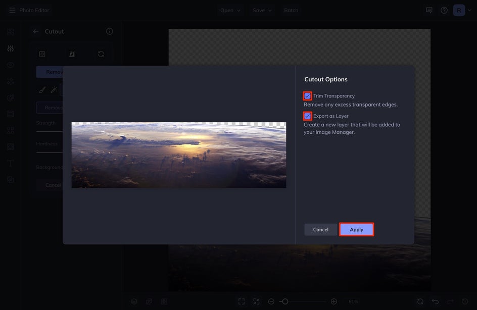When you are ready, select Apply. Immediately in the next screen, make sure that you select Trim Transparency and Export as Layer. This is crucial to achieving this text. When you select these, the new layer will show up in your Image Manager.