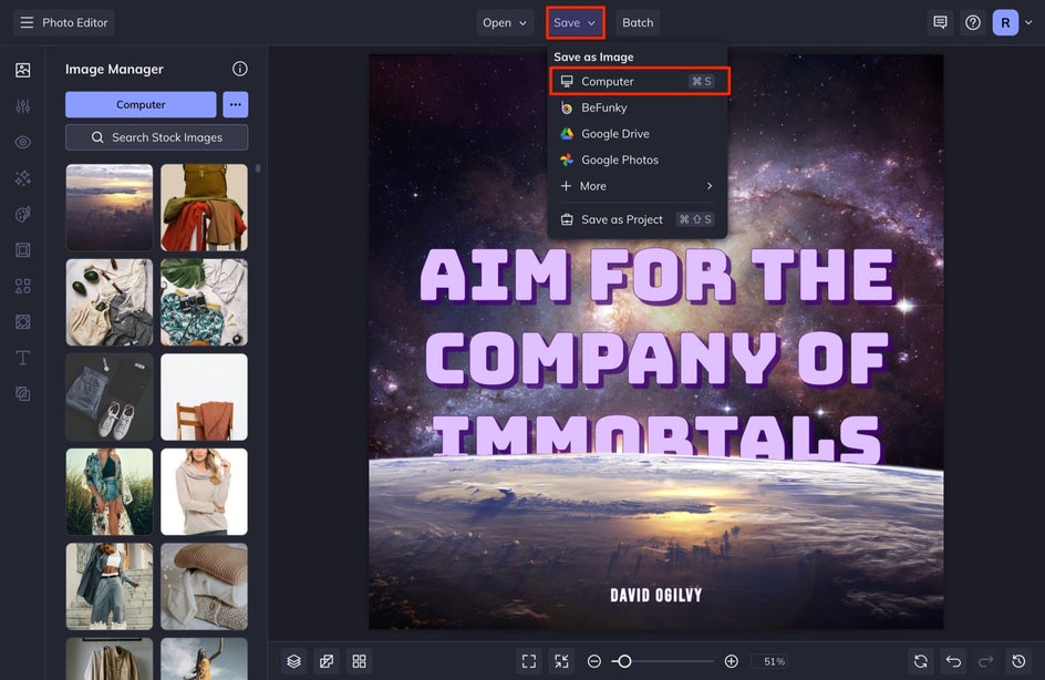 When a motivational quote is paired with an inspiring photo, you get something that’s both beautiful in word and design. You can choose any image for your background but make it something beautiful. You can also choose a photo that is relevant to the quote to help communicate it better. BeFunky has thousands of images you can use in their stock photo selection. In BeFunky’s Photo Editor, select Open, then hover over More, and select Stock Photos.