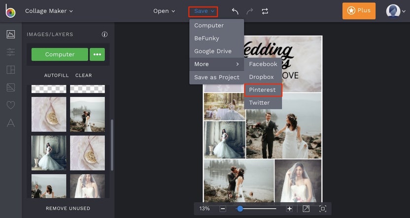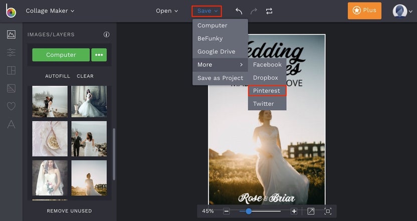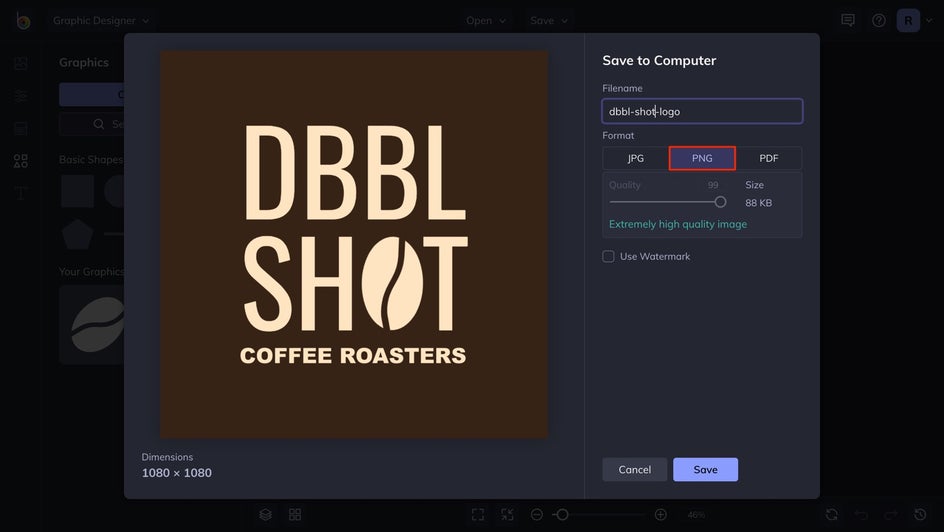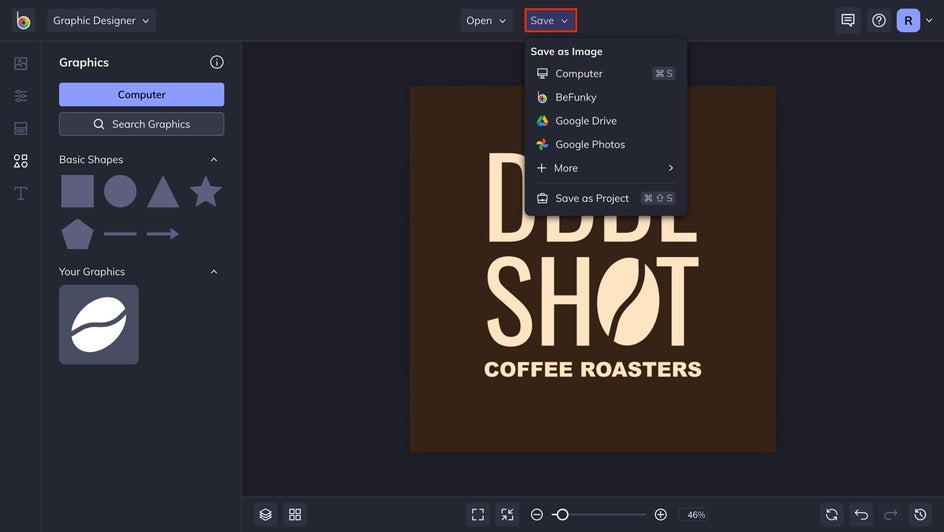 Once you’re satisfied with your logo, save it by clicking the Save button above your canvas, followed by your desired destination. We recommend saving your project to BeFunky for easy editing in the future.