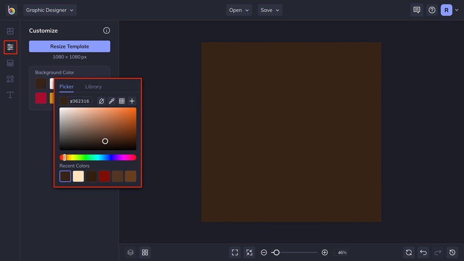 Next, you’ll want to determine whether you’ll want a colored background for your logo or not. If you’re sticking with a white background, feel free to skip this step. To add color to your background, click the Customize tab in the icon menu on the left, followed by the first color tile under the Background Color section, then select your desired color.