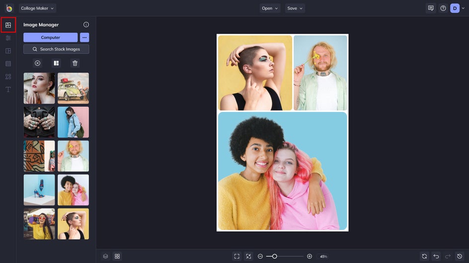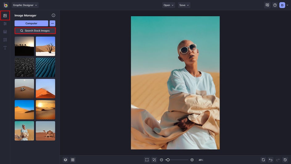 Next, let's add an image. You can drag and drop an image from your computer, click on the Computer button found in the Image Manager, or use our Search Stock Image function to find the perfect royalty-free image. All images will appear in your Image Manager.
