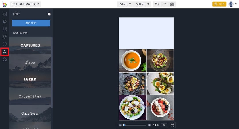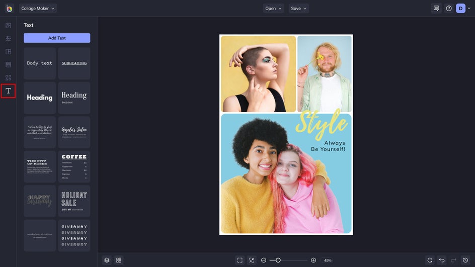 With your images perfectly in place, it’s time to add a clear and catchy title! You can do this by navigating to Text in the left-side menu. You can either select a text preset from the list and customize it, or click the Add Text button to start your text overlay from scratch.