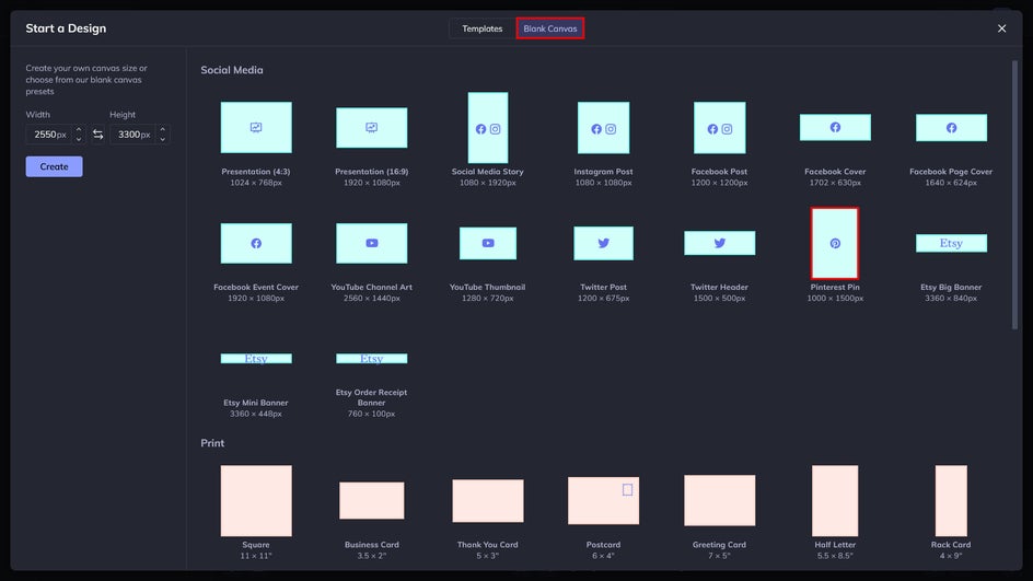 If you clicked on the link above, you will automatically be brought to the Templates section. From here, head to Blank Canvas and click on Pinterest Pin. Similarly, you can choose a predesigned template and edit to your liking. But for this tutorial, we'll start from scratch.