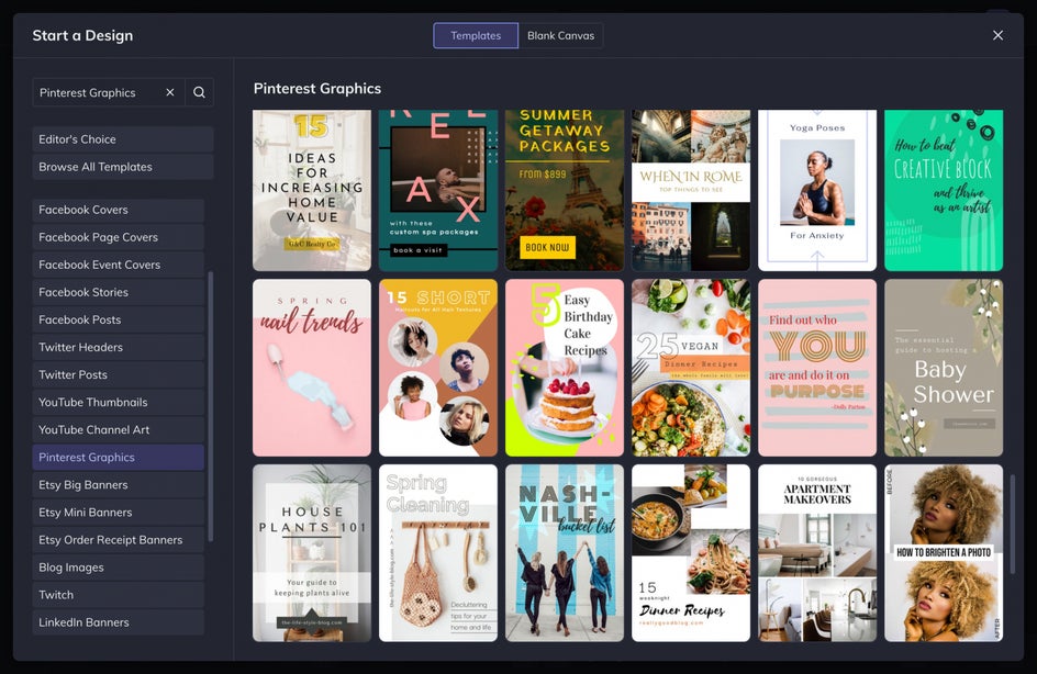 In BeFunky’s Designer, select the Template tab. Then select Pinterest Graphics from the Social Media drop-down in the left-hand menu. Select the template you want and then click Use This Template.