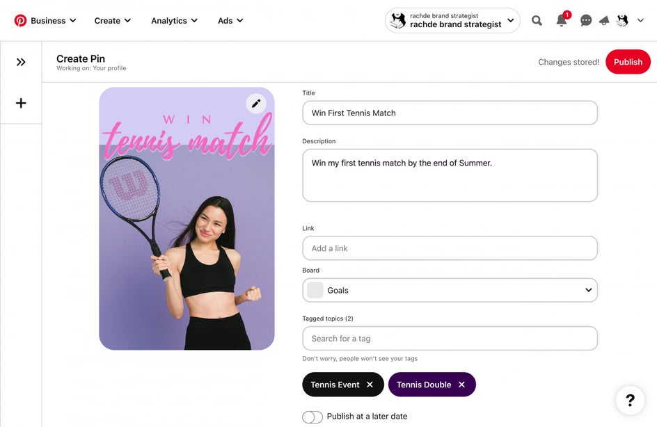 Upload your photo and add a title and description to your Pin. You can also add a tag so that it is easier for you to search for it later on if you need to locate it. When you are all finished, select Publish in the top right.