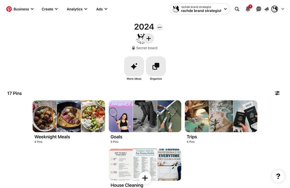 Let’s say that we want to create a general Pinterest board for a variety of 2024 goals including home cleaning, travel plans, meal plans, and some personal goals for the year. We could create a board for each of these things, but because of Pinterest Board Sections, you can create sub-categories within a board to help keep you organized.