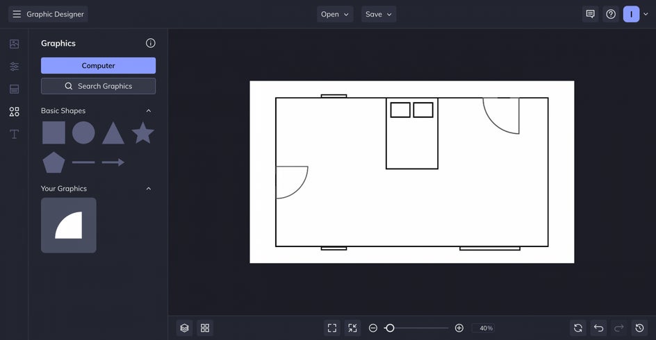 To create your own floor plan for free, first, open the Graphic Designer. Begin by creating a top-down view of your room with the walls, windows, doors, and any big appliances. For these stages of room planning, you don’t need to have pinpoint accuracy. You can use this diagram as a general outline, and measure the room and furniture later.