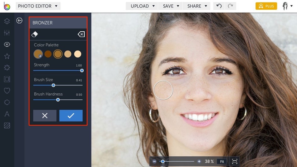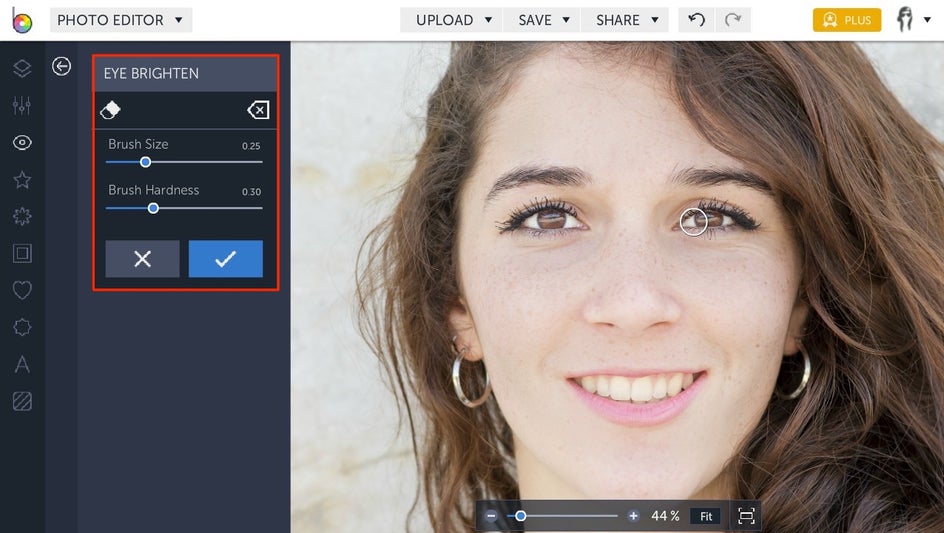 You can use the sliding scales on the left to adjust the brush size and hardness. If your subject has particularly discolored eyes, whether from staying up too late or otherwise, an increase in brush hardness should do just the trick. When you’re finished, click Apply.