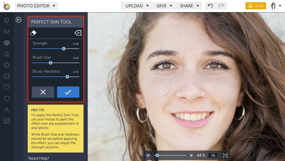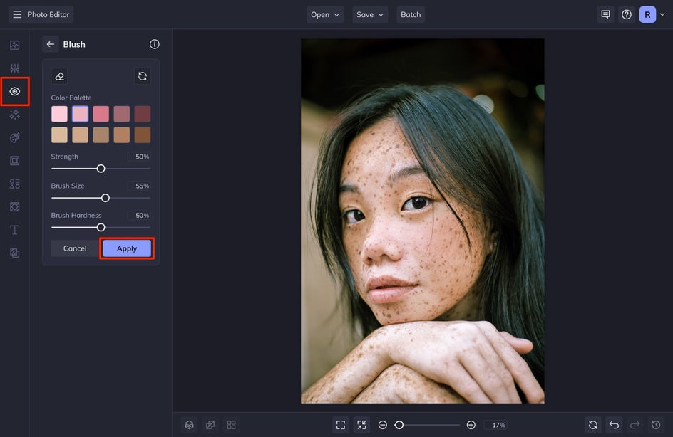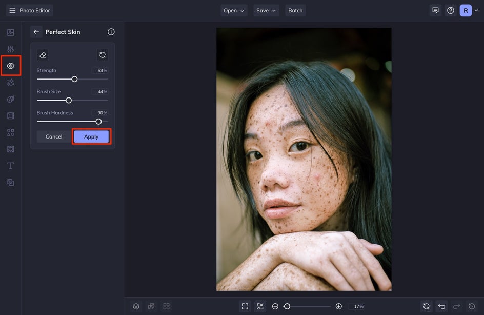 You can use the sliding scales on the left to adjust the strength, brush size, and brush hardness. Once the portrait is looking just right, click Apply. To see a quick before and after, press the ‘o’ button on your keyboard (‘o’ stands for original) to see how the Perfect Skin tool has enhanced your photo.