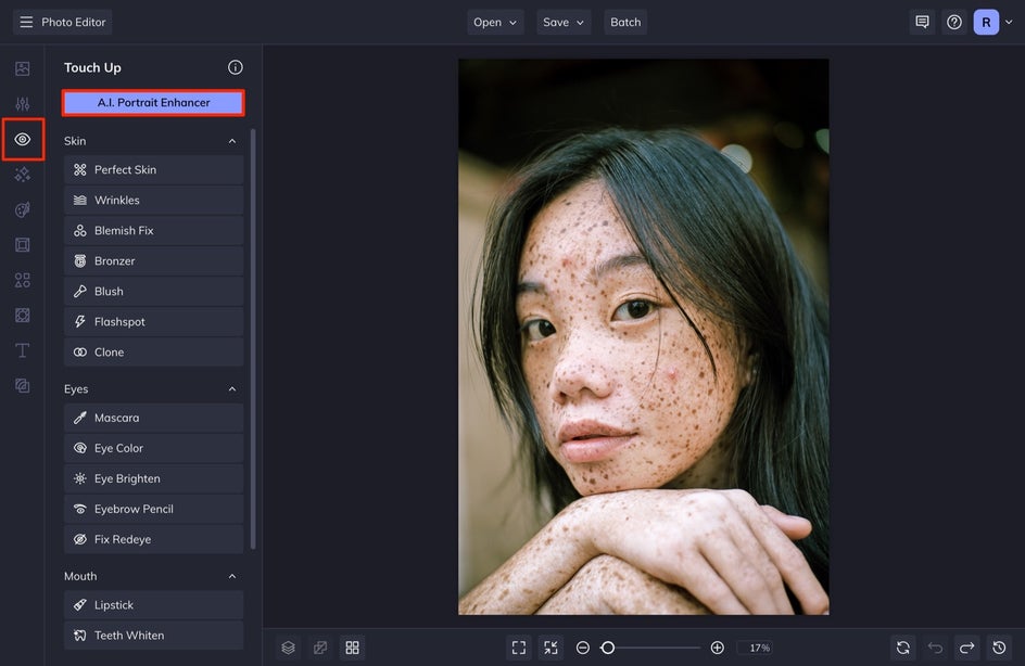 Before you get into the details, try using the Portrait Enhancer to see instant results. This tool uses the power of A.I. to correct exposure, balance color, and more to enhance your subject's best features.