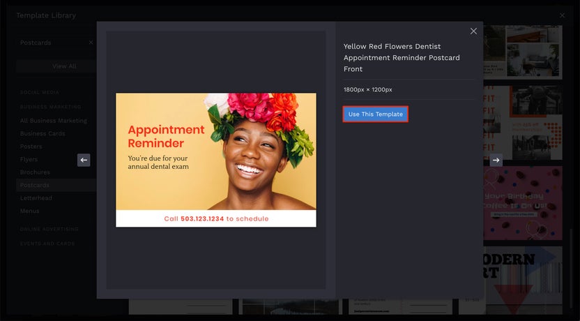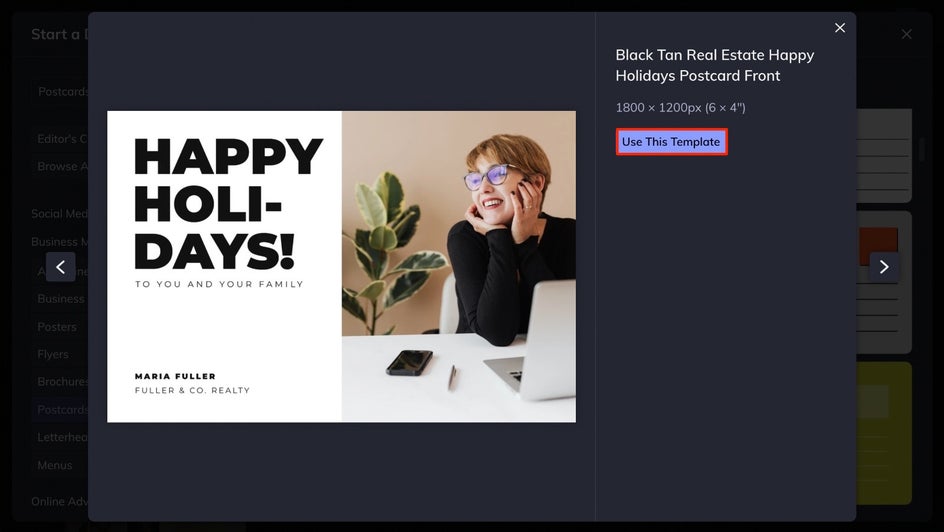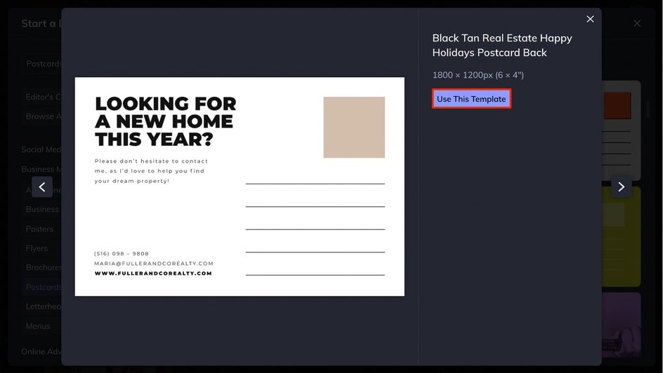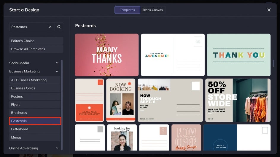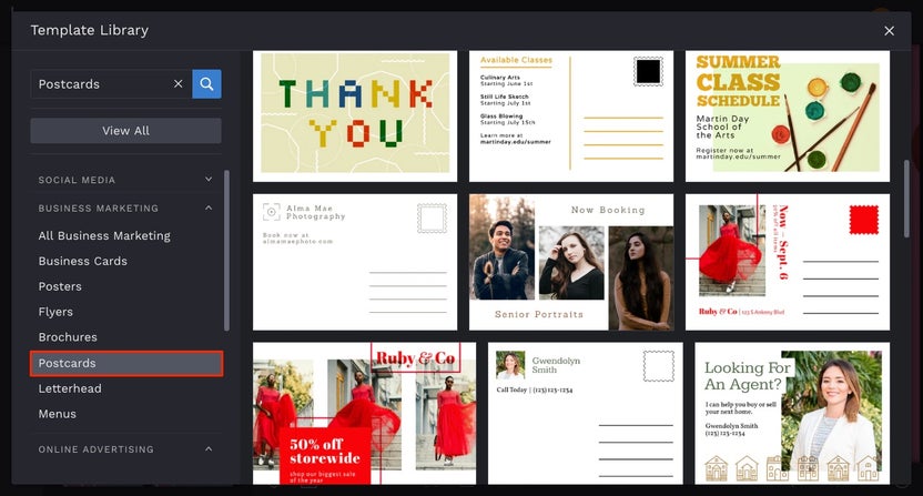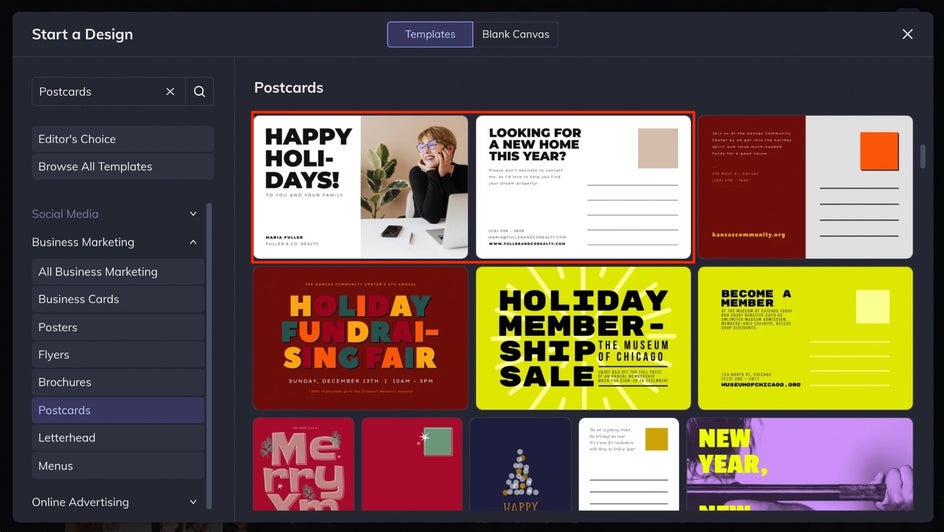 Each postcard design includes two templates – one for the front and one for the back. Browse through the available templates and pick one that best suits your marketing needs, whether that’s building awareness, garnering leads, or promoting a sale. We’re going to start by editing a front template, which usually includes a central image, some fun design elements, and a bold headline.