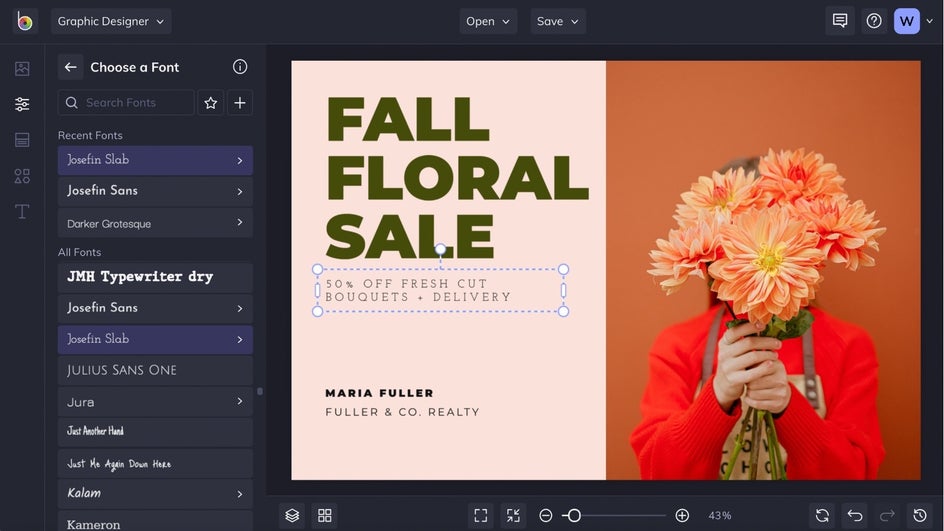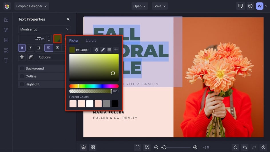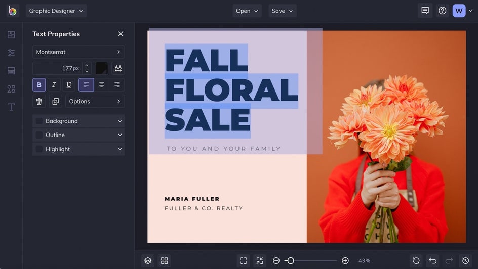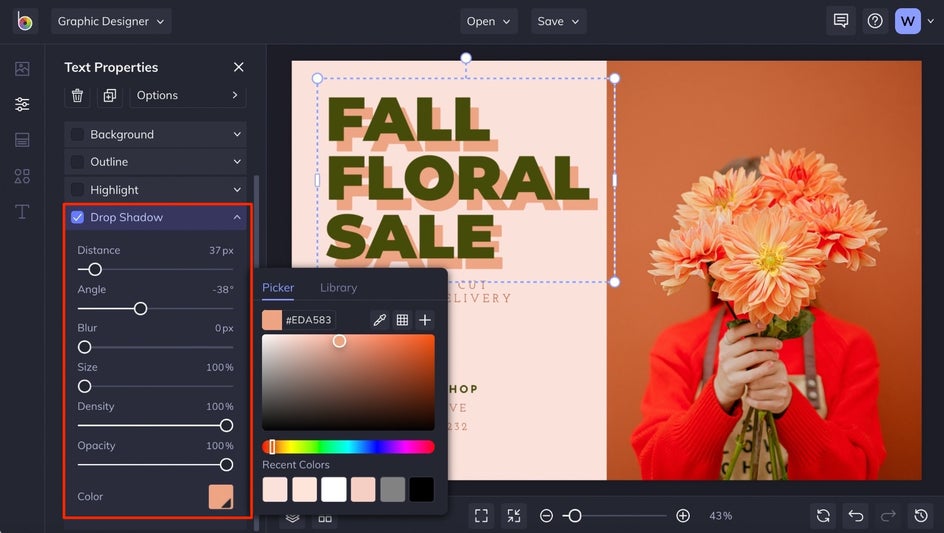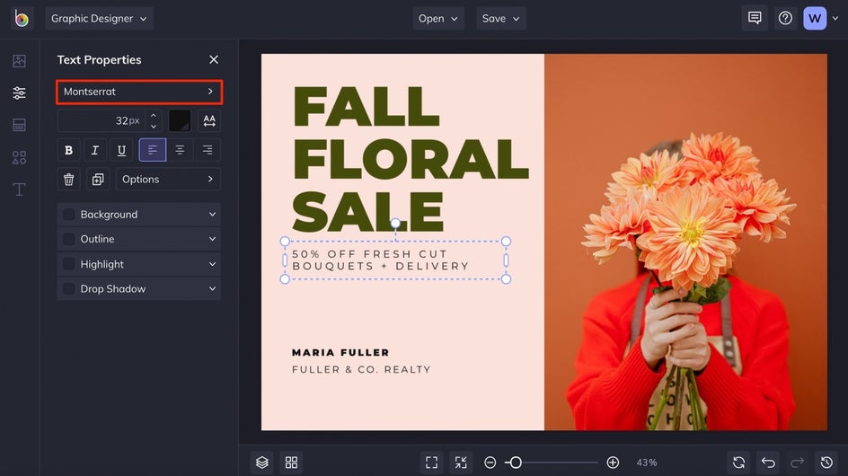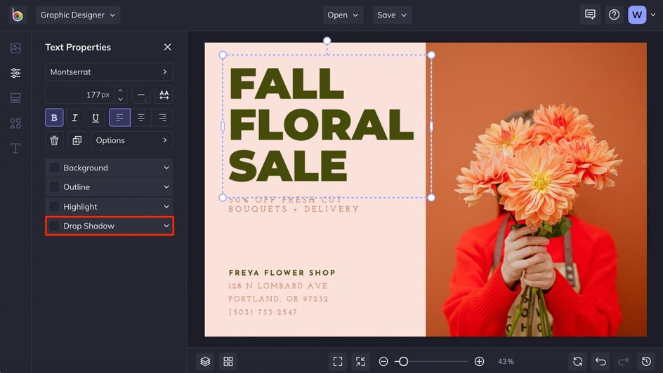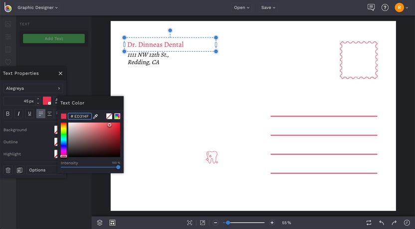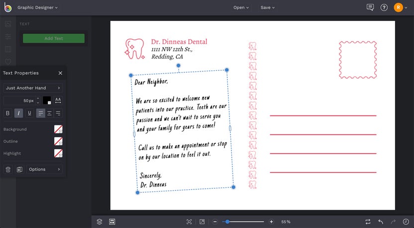 It’s time to personalize the remaining design elements so that the postcard aligns with your campaign and overall brand. Replace copy and change fonts with the Text tab. Customize any text box with a background, outline, drop shadow, and more.