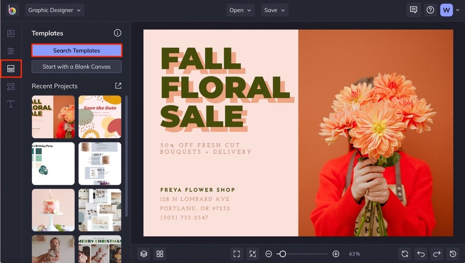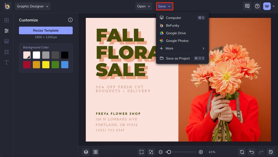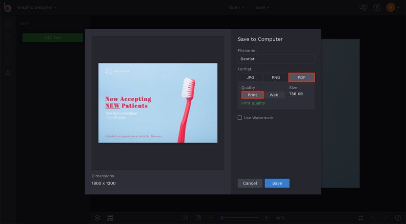 After finalizing the design, click Save at the top of the canvas and save the file as a print-quality PDF. This will provide the best printing results. In addition, you may want to Save as Project so that there’s an editable file to return to later.