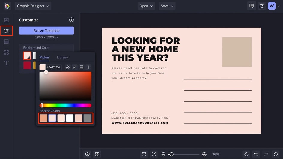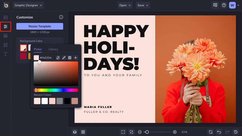 Background color and canvas size can be adjusted in the Customize tab. All of BeFunky’s postcard templates are 4x6”, which is the standard postcard size, but if you want to use a non-standard size, the Smart Resize tool makes it easy.