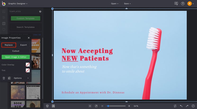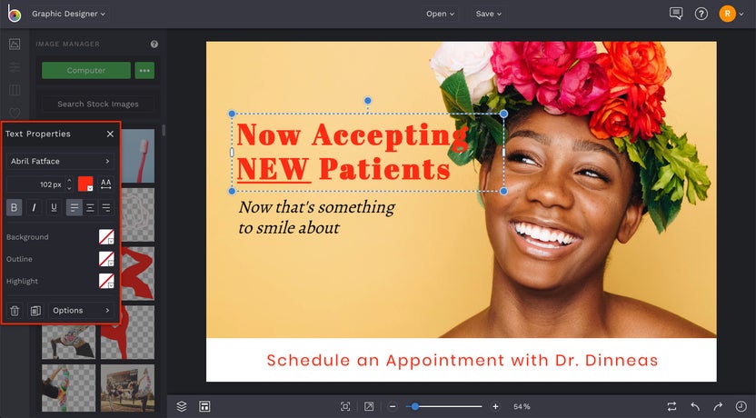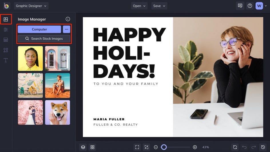 As with any form of marketing, visuals are essential to a business postcard. Use the Image Manager to upload your own photos or choose from over a million free stock photos. Then, drag and drop photos from the Image Manager onto the canvas to replace the placeholder images.