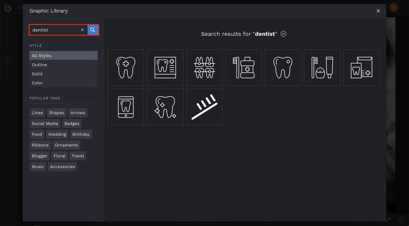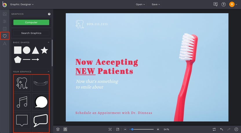Use the Graphics tool to add vector graphics to the card design. Click Search Graphics to find something specific to your brand or aesthetic. Consider adding your small business logo by uploading it right from your computer.