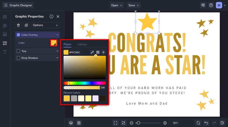 You can also change the color of your template’s existing or new graphics, if you wish. To do so, just click on the graphic you wish to change and a Graphic Properties panel appears. Then, click the Color Overlay or Graphic Colors swatches (depending on your graphic) to select a new color from the Color Picker.
