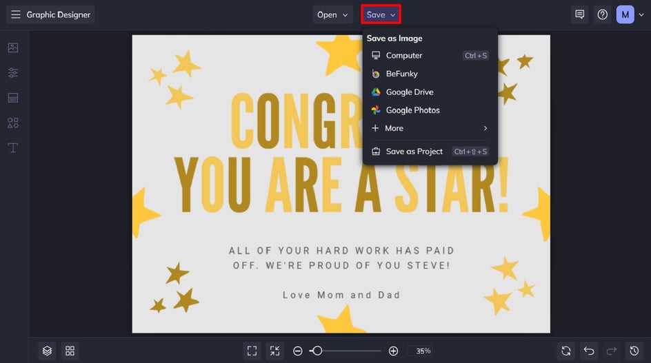 Depending on the congratulations card template you choose, you may have additional changes you want to make, such as swapping out the photo, for example. However, once you’ve finished customizing your card, all that’s left to do is to save it. Click Save at the top of the screen, then select your desired save location.