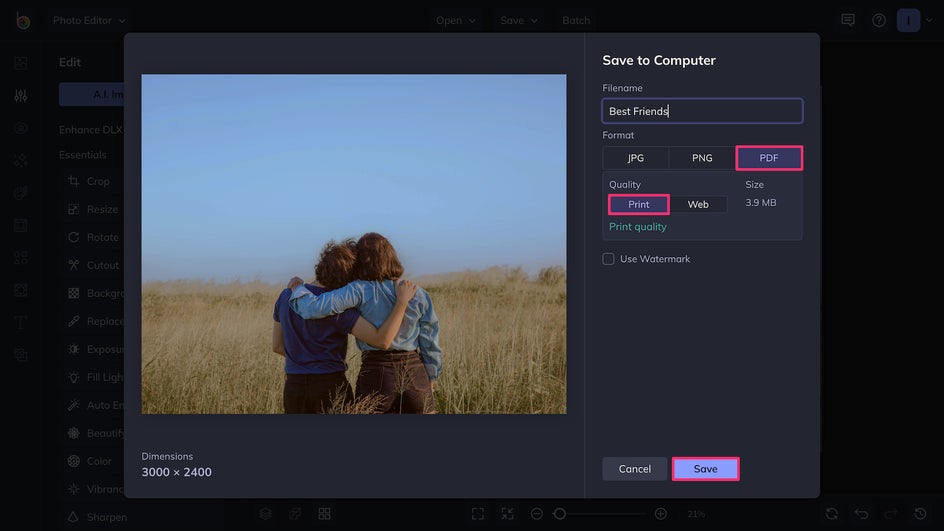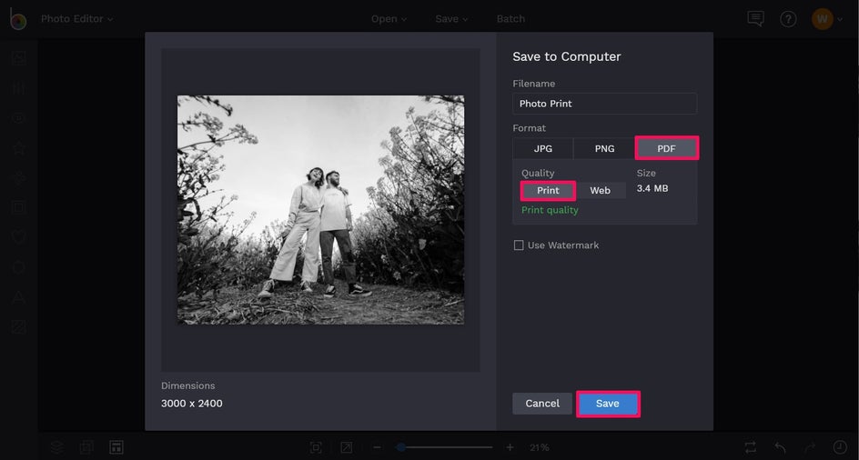 Once you’ve finished adjusting and editing your photo to your liking, there’s one last step you’ll need to take - saving your photo. Navigate to Save at the top of the screen, followed by Computer, then PDF. Under Quality, select Print. This allows you to save your photo in the highest quality possible, making it perfect for printing.