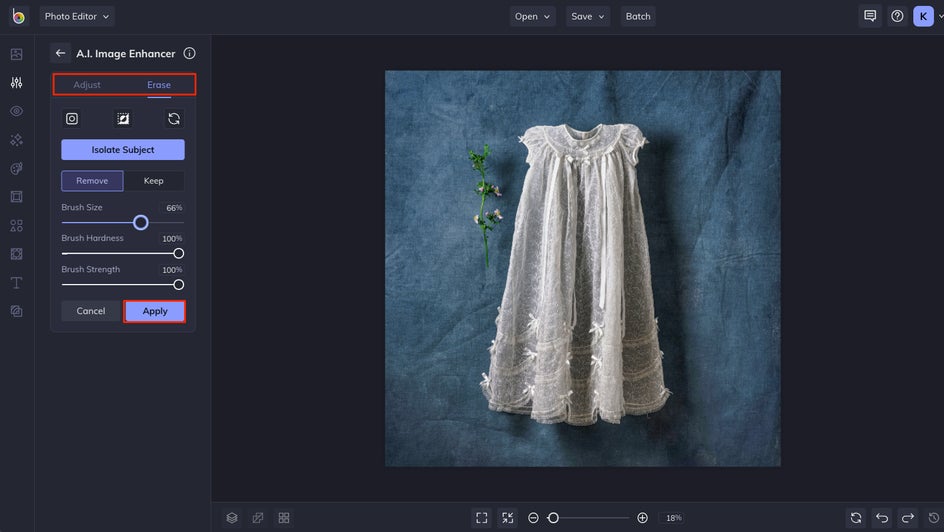 Under the Erase tab, you’ll have access to the full scope of Eraser tools. Use the Remove and Keep buttons as well as the brush options to either add or subtract the enhanced results onto your image.