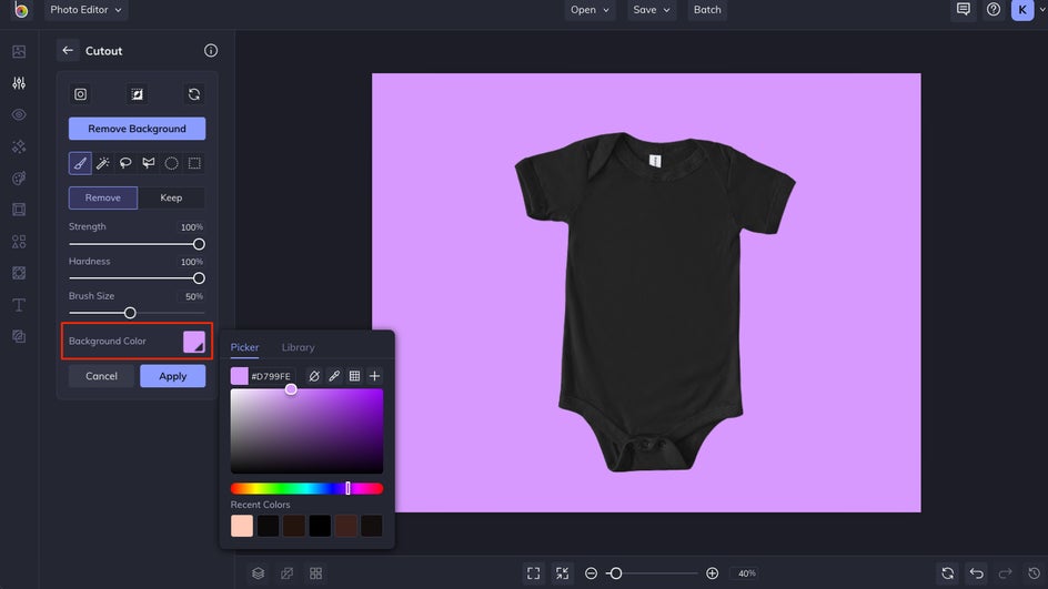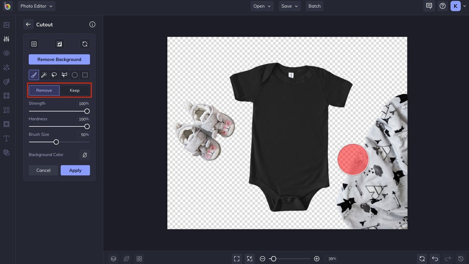 If you find the background remover had some sections leftover that you don’t need, or that it went too far and you want to add some of the image back, use the Remove and Keep buttons to adjust the background until you get the results you want.