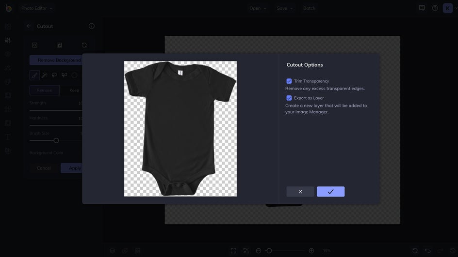 When you have results how you want, click the Apply button. Here you’ll see options to Trim Transparency around the image, which will cut away excess canvas. You can also choose to Export as Layer, which will save this cutout as another image layer in your Image Manager.