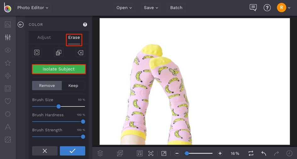 If you need to clean up any areas, enter the Erase tab and then select Isolate Subject. You can then switch between the Remove and Keep tabs to paint over the section of your image you want the new color to be applied to, or remove the color from sections you need to clean up. I make sure to keep my Brush Hardness at or below 50% and Brush Strength between 50-70%. This way it will slightly paint the target color onto your product and it will look more natural.
