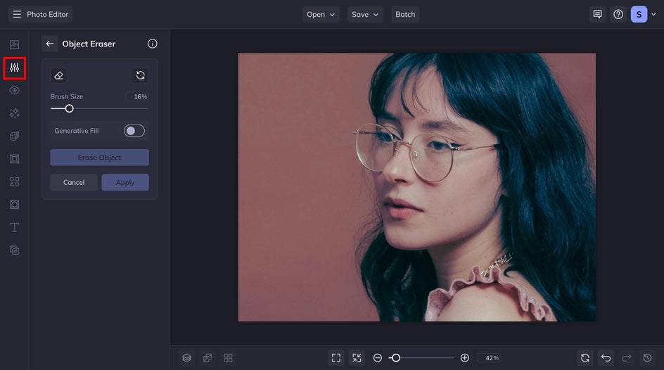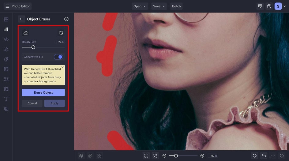 From the Object Eraser menu, adjust the brush size using the corresponding slider and use your cursor to brush over the flyaways you wish to remove. These areas will be marked in red. Then, to remove them, click Erase Object. This tool then uses advanced AI technology to blend the area around the flyaways to erase them seamlessly. If you're working with a very detailed background, you may want to take advantage of the Generative Fill feature.