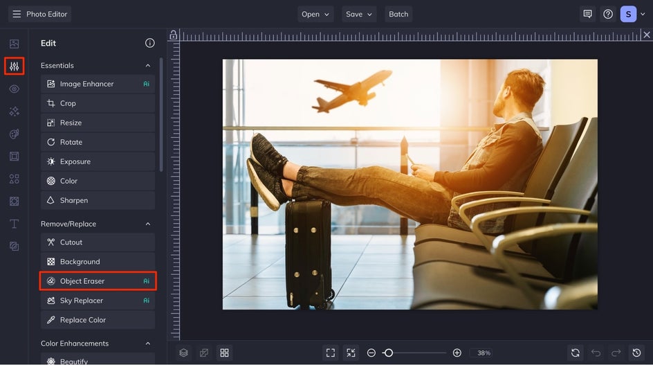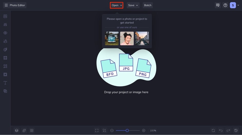 Get started by uploading your image in the Photo Editor. You can either upload from your computer by clicking the Open button at the top of the interface, drag and drop the photo you want to work with, or start with a stock photo. You can also head directly to the Object Eraser by clicking here.