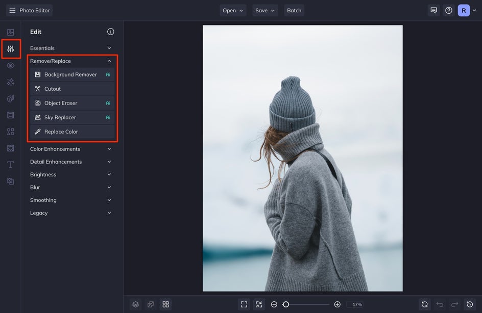 From the Edit menu, select the Background Remover tool under the Remove/Replace tab. The AI will automatically get to work. detecting the main subject in your photo and erasing the background behind it in seconds. Any removed area of your image will look like a checkerboard, which means it’s now transparent. You can stop here or keep going in order to make adjustments like replacing the background with a color or a new image.