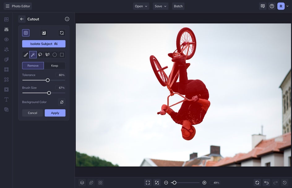 From the Edit menu, select Cutout from the Remove/Replace drop-down. Select Isolate Subject to let BeFunky do all the heavy lifting. There are so many options included within the Cutout tool that it makes cutting out any subject a breeze. Some of my favorite brushes are the Magic Brush, the Lasso, and the Polygon tool. The Magic Brush makes it so simple to clean up any areas where the Isolate Subject tool didn’t quite get it right the first time.