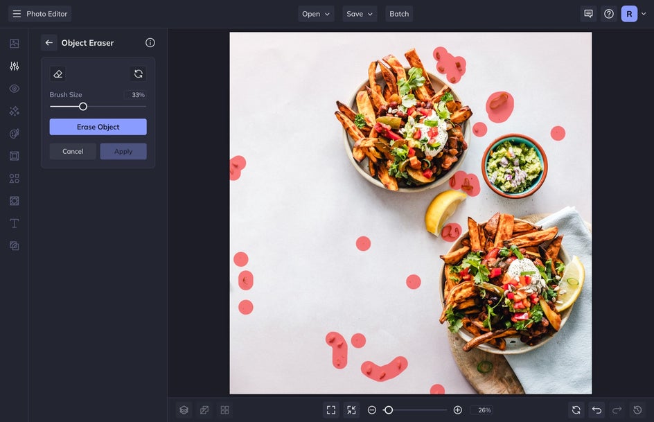 Not only is the Object Eraser tool helpful for getting rid of distracting objects like photobombs or stop signs, but it can also take care of small things like a stray crumb in your food photography or a tattoo on someone’s arm.